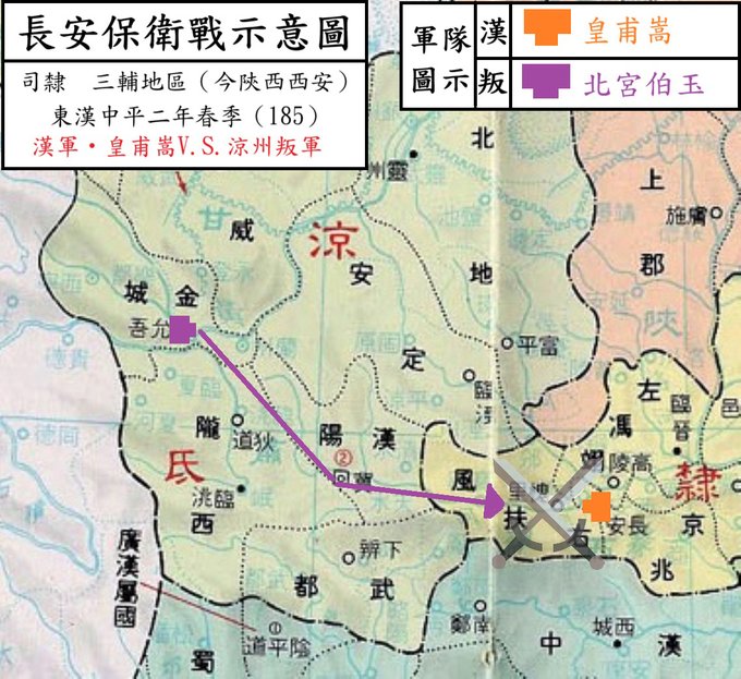 皇甫嵩隨後與入侵三輔(長安一帶的地區:司隸的京兆尹、左馮翊、右扶風)的北宮伯玉等人作戰,雖與揚武都尉陶謙等人大破叛軍,也守住了長安,但屢次作戰仍無法討平,又因黃巾之亂時得罪過宦官趙忠及張讓,遂被二人表奏「連戰無功,所費者多」,上任4個月後因宦官誣陷於7月或8月被免職。而邊章、韓遂等勢力大盛,董卓征討無功。涼州的持續叛亂使國庫大損,朝廷不得不課稅、徵召勞力以應戰。